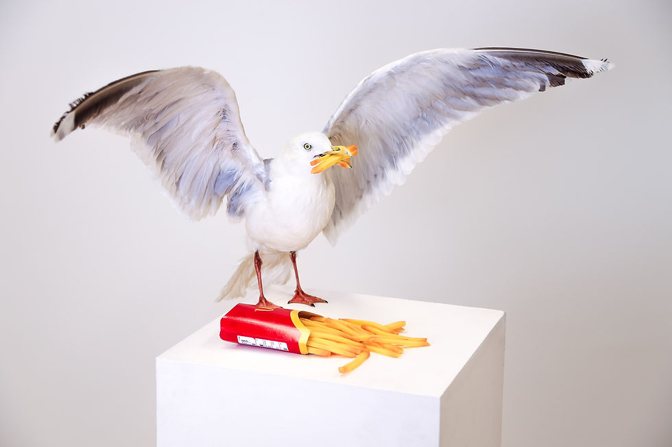 2022 120 x 70 x 65 cm Ethically sourced herring gull, plastic, and paper